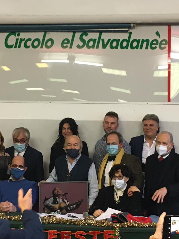 FOTO DI GRUPPO DEI PREMIATI (MARCO BALDINI, PAOLO LUNGHI, ANTONIO MANCINI DI RADIO VATICANA, MASSIMO EMANUELLI, CON TONINO LUPPINO, ORGANIZZATORE DEL MEETING) E LE ISTITUZIONI LOCALI.