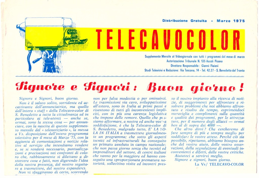 l’altro 50% viene acquistato; e, altra grande novità, i programmi vengono mandati in onda a colori (la Rai inizierà a mandare in onda i primi programmi a colori soltanto l’anno successivo). Ciabattoni e Valeri allargano il raggio di copertura dell’emittente che viene ribattezzata Tele Piceno, i sambenedettesi si sentono defraudati e pochi mesi dopo si passa alla denominazione Telecavocolor (per sottolineare l’avvento del colore). ma per gli abitanti della località marina l’emittente rimane sempre Telecavo. Fin dal marzo 1975 gli abbonati possono usufruire di un giornalino che informava gli spettatori della programmazione del mese.