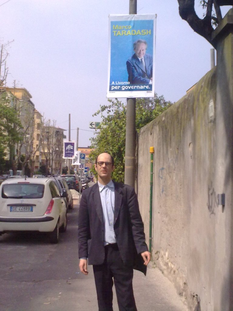 APRILE 2009 MASSIMO EMANUELLI DAVANTI ALLA SEDE CHE FU DI TELELIVORNO, MASSIMO EMANUELLI PRESENTA IL SUO LIBRO SU FUNARI, GIRANDO PER LIVORNO VEDE UN CARTELLO CON LA SCRITTA MARCO TARADASH A LIVORNO CON FORZA ITALIA. “CANDIDATO PER GOVERNARE. MASSIMO EMANUELLI RIBADISCE: “SE PEPPO SACCHI E TELEBIELLA SONO ENTRATI NEL MITO, PAOLO ROMANI E MARCO TARADASH SONO ENTRATI IN FORZA ITALIA (OGGI PDL) PECCATO CHE NON VOTO A LIVORNO. VOTO A MILANO….” AAAAHHHH.