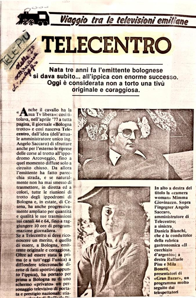 Emittente nata a Bologna nel 1977 all’interno dell’Ippodromo Arcoveggio in via Corticella, irradiava i suoi programmi dal canale uhf 44, successivamente si trasferì a San Lazzaro di Savena in via Benassi 57 nei locali di un ex-cinema, il K2. Il primo editore è una società di piste di cavalli (la Cesenate Trotto della famiglia Grassi). Direttore è l’ingegner Saccaro, il piatto forte del primo palinsesto sono infatti le trasmissioni in diretta dall’Ippodromo di Bologna Arcoveggio (dieci ore giornaliere), con tanto di rubriche come Filo diretto con la pista di Bologna gestita dal giornalista Arrigo Martino, Roller camera gioco a quiz presentato da Daniele Cattani. Corse di trotto in diretta, replay e quiz sui cavalli vincenti condotti da Daniele Cattani, costituiscono l’asse portante del palinsesto. Non mancano un tg locale, film, telefilm, rubriche sportive con Alberto Bortolotti e programmi cult delle emittenti locali anni ’70 come GRAN BAZAR condotto da Raffaele Pisu (che nel primo periodo si registrava proprio negli studi di Telecentro) e SUPERCLASSIFICA SHOW condotto da Maurizio Seymandi, sport, quiz. Fra gli altri programmi: LE CORSE IL GIORNO DOPO, FILO DIRETTO CON L’ARTISTA (dedicato a scultori, pittori, scrittori e poeti), BAR CAMPIONE ROSSOBLU condotto da Giuliano Sorrentino, dedicato al Bologna calcio con tanto di quiz e gioco fra i bar di Bologna. Fra la fine degli anni ’70 e l’inizio degli anni ’80 si avvicinano all’emittente alcuni notabili della Dc; all’inizio degli anni ’80 il pacchetto azionario di TeleCentro viene rilavato dal gruppo de Il Resto del Carlino, TeleCentro inizia a produrre su due edizioni del telegiornale seguendo capillarmente non solo la cronaca del capoluogo della Regione, Bologna, ma anche i fatti e le situazioni più significative di tutte le altre province., un altro quiz è Giochiamo al Master MInd condotto da Daniele Catani e Mila Bonetti. Nel 1982 entra a far parte del circuito Euro Tv, nel 1985 TeleCentro viene rilevata dall’imprenditore modenese Rossano Bellelli, che ha anche rilevato la concorrente TelSanterno. Telecentro (che nel frattempo ha allargato la sua area di copertura irradiando i suoi programmi anche dai canali uhf 42,52, 60 e 63) nel 1987 entra a far parte della syndacation Odeon Tv conservando comunque una fascia di programmazione locale consistente nel tg BOLOGNA CRONACHE, in incontri di basket e di calcio programmi sportivi e nel gioco a quiz condotto da Paolo Alberti LA GIOSTRA DEI DESIDERI.