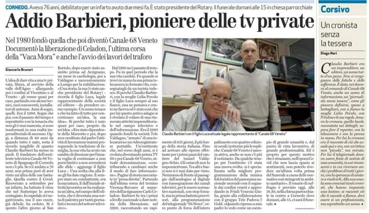 TeleVadagno Canale 68, nel 1987 si chiama semplicemente Canale 68. Per un certo periodo l’emittente ritrasmette i programmi di Viva. Il palinsesto propone un notiziario (68 NEWS) in otto edizioni, dirette in studio con telefono aperto, inchieste, lo spettacolo MUSICA REMEMBER, PER VOI GIOVANI (con musica da discoteca), sport, documentari, film, telefilm, telenovelas, inchieste giornalistiche, e il programma VOLLEY TIME. Con l’avvento del digitale terrestre Canale 68 si presenta in un mux che comprende anche Canale 68 News 24, Canale 68 Emozioni, Canale 68 Movie e Canale 68 Shopping. Nel 2012 ha inizio la crisi del gruppo editoriale che deve chiudere i canali tematici, resta in vita solo l’emittente ammiraglia all’interno di un mux di prorpietà del gruppo TelePadova/7Gold. Il 17 novembre 2020, stroncato dal coronavirus, muore Claudio Barbieri fondatore dell’emittente.