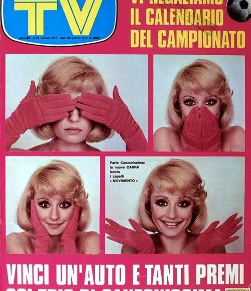 Quella del 1974 fu l’ultima edizione di Canzonissima. In onda dal 6 ottobre 1974 al 6 gennaio 1975 a cura di Dino Verde ed Eros Macchi, orchestra diretta da Paolo Ormi, coreografie Don Lurio, scene di Gaetano Castelli, costumi di Silvio Betti, regia di Eros Macchi, con Raffaella Carrà, Cochi e Renato e Topo Gigio. Sigla di apertura FELICITA’ TA’ TA’, sigla di chiusura E’ LA VITA LA VITA. Oltre alla gara fra i cantanti di musica leggera per la prima volta venne istituita una gara fra i cantanti folk. In onda come nell’edizione precedente la domenica pomeriggio alle 17,40 sul Canale Nazionale e in radio sempre sul canale nazionale, veniva preceduta alle 12,55 da un Anteprima Canzonissima condotta da Raffaella Carrà e con Maria Giovanna Elmi. In radio il lunedì sul canale nazionale andava in onda Canzonissima 1974 con Silvio Gigli con Violetta Chiarini Elisa Ghiberti e Maurizia Antonini.