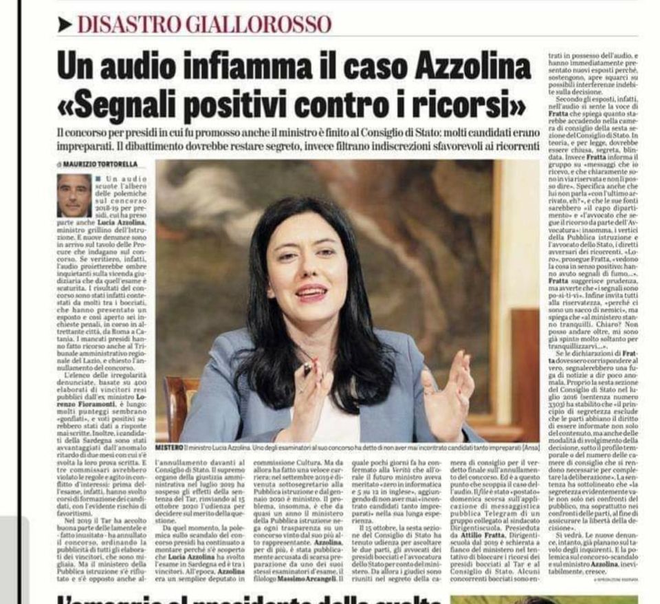Lucia Azzolina specializzatasi copiando una tesi (accusa del prof.Arcangeli) entra nelle graduatorie ad esaurimento grazie ad un ricorso. In seguito viene assunta per titoli e servizio senza fare un concorso. Docente precaria in Liguria entra in ruolo a Biella. Insegna pochissimo, poi fa la sindacalista, promettendo ai precari la stabilizzazione. Eletta si rimangia tutto e si rifiuta anche di ricevere i precari. Nel 2017 Azzolina fa un concorso per dirigente scolastico (Preside) e lo vince quando è deputata 5 Stelle e membro della Commissione Istruzione e Cultura della Camera, che per Statuto si occupa di concorsi scolastici, è come se il più grande imprenditore televisivo italiano scendesse in politica… o come se il Presidente di una Regione vendesse camici alla Regione stessa (in tempo di covid…) ad un’azienda di proprietà del cognato… All’orale Azzolina viene giudicata dalla Commissione 0 su 6 in informatica e 5 su 12 in inglese, anche se era preparata sulla normativa scolastica. Azzolina alla fine diventa Preside. Successivamente si scopre che le prove scritte di quel concorso (gli scritti, non gli orali) sono state fortemente discutibili e ora sul concorso indagano sei procure di tutta Italia. I ricorrenti (una quota di docenti candidati alla gara e poi bocciati) accusano la ministra di opporsi alla richiesta di far conoscere gli atti. La ministra durante l’emergenza covid, sposa la didattica a distanza, quindi assicura la promozione a tutti gli studenti, salvo poi rimangiarsi quanto detto in precedenza. Si arriva all’estate con la ministra concentrata sui banchi, senza pensare ad implementare i supporti informatici, né alle nomine dei docenti supplenti precari. E così si arriva a nominarli in ritardo rispetto agli anni precedenti (quando il covid non c’era), le scuole devono ridurre l’orario a causa della penuria di docenti. Il 14 settembre inizia l’anno scolastico (in alcune regioni, in altre invece si ritarda causa elezioni, anche qui maggioranza e opposizione sodali, più utili le elezioni della scuola…). Il 24 settembre iniziano le lezioni in tutta Italia, è il trionfo di Azzolina, non curante del problema dei mezzi pubblici affollati e non comunicante (o giocante a scaricabarile) con la collega ministro dei trasporti. Con l’inizio del mese di ottobre si iniziano a registrare i primi casi di contagi e classi in quarantena, ma la ministra sminuisce. I contagi salgono di giorno in giorno, in Italia intanto aumenta il numero di infetti, morti, ricoverati, la ministra ribadisce: “le scuole non si chiudono”. Michele Emiliano, governatore della Puglia, aveva già fatto presente il problema scuole/mezzi pubblici (Cassandra inascoltata) in estate, analogamente il governatore della Campania Vincenzo De Luca. Nonostante il parere di alcuni virologi Azzolina ribadisce: “la scuola non si chiude, non si torna alla didattica a distanza”. Giovedì 16 ottobre il governatore della Campania dopo l’impennata di contagi registrata nelle ultime 24 ore nella sua Regione (seconda dopo la Lombardia) prende la sofferta decisione di chiudere per 15 giorni le scuole e tornare alla dad, Azzolina dichiara: “decisione gravissima, sbagliata e inopportuna”. Azzolina parla di “diritto all’istruzione”, De Luca di “diritto alla salute”. Prende le difese del ministro il premier Conte, gli alleati di governo del Pd ammiccano o tacciono, io non c’ero e se c’ero dormivo. A confondere ancora di più la questione è il fatto che mentre Azzolina rivendicava la didattica a distanza (a fini propagandistici) la responsabile scuola del Pd sosteneva l’esatto opposto nel corso di un’intervista rilasciata da Radio Uno. “Le scuole non chiuderanno mai” ribadiscono anche Matteo Salvini e Giorgia Meloni.
