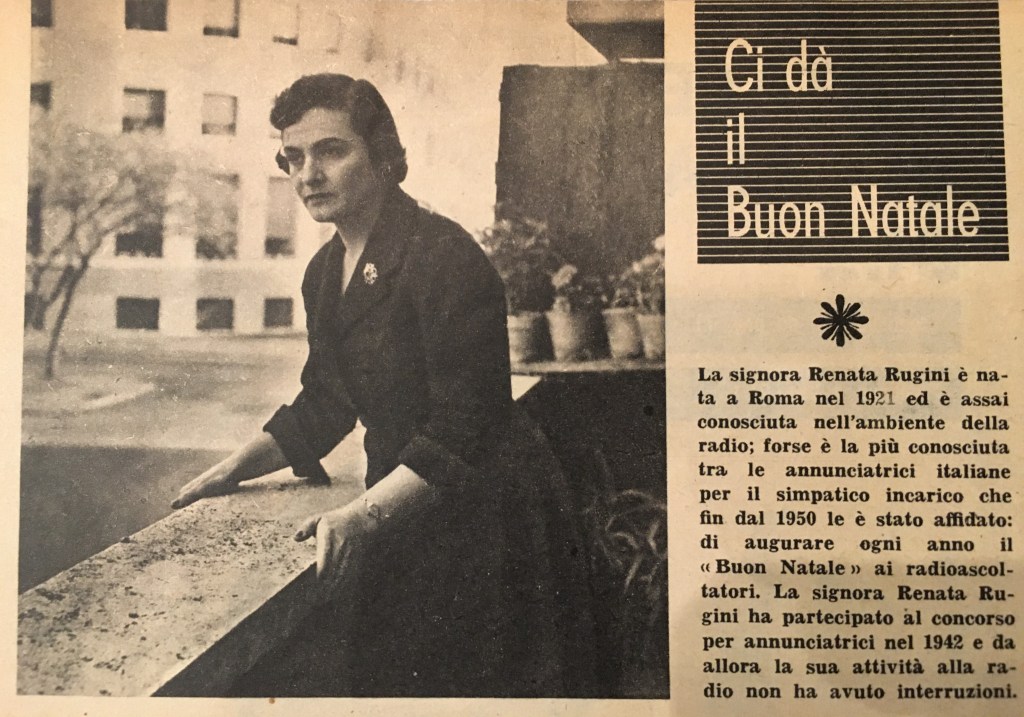 Renata Rugini nacque a Roma il 21 marzo 1921, si diplomò all’istituto magistrale ed iniziò ad insegnare in una scuola elementare, quindi si iscrisse all’Università Orientale di Napoli facoltà di lingue straniere. Il suo sogno era quello di diventare una professoressa di inglese. Un giorno spinta dalla curiosità per la radio entrò negli studi di via Asiago, a due passi da casa sua, poi si lascia coinvolgere ad un concorso per radioannunciatrici. Compiuta la prova e toltasi la soddisfazione di entrare in uno studio, venne chiamata nei giorni successivi dalla direzione dell’Eiar ma era a Napoli. Nel 1942 entrò all’Eiar come annunciatrice, intanto si laurea. E’ lei ad annunciare il primo bombardamento aereo su Roma, quindi seguono lunghi, monotoni, tristi elenchi. Ottiene quindi un attestato di riconoscenza del Governo Militare Alleato Regione Lazio e Umbria con il quale probabilmente avrebbe prestato collaborazione in qualità di interprete. Trasformatasi l’Eiar in Rai Renata Rugini ha l’incarico di “collaboratrice addetta all’Ufficio Stampa per notizie dalla Stampa Estera e traduzioni” e, successivamente, “collaboratrice addetta all’Ufficio Stampa per il servizio pomeridiano. Rientrano nei suoi compiti quello della segnalazione ai giornali pomeridiani e segnalazione delle notizie inerenti al servizio. Dovrà inoltre curare la correzione delle bozze del Radiocorriere per quanto riguarda i nomi, i titoli e le frasi in francese e in inglese”. Nella seconda metà degli anni ’50 annuncia, sempre in radio, comunicati e notizie. Nel 1950 Renata Rugini si sposa con il dottor Clinio Ferrucci, lettore dei notiziari per il giornale radio del programma Nazionale. Nel 1951 Renata Rugini, con Paolo Valenti ed altri colleghi, tiene a battesimo Radio Sera (giornale radio del secondo programma radiofonico), il primo rotocalco radiofonico e primo esempio di informazione-spettacolo. Vi collaborarono giornalisti di grande abilità ed esperienza professionale: Italo Neri (redattore capo), Ugo Martegani (per la politica interna), Massimo Rendina (alla politica estera), i radiocronisti Mario Ferretti, Paolo Valenti ed Enrico Ameri, capitanati da Carlo Bonciani; Eugenio Danese e Guglielmo Moretti per lo sport; Renato Venturini per la cronaca; Federico Zardi per il “colore e varietà”. Gli annunciatori erano stati scelti, al termine di una selezione rigorosa, per formare una pattuglia affiatata e di prim’ordine: Gigi Carrai, Paolo D’Ovidio, Corrado Mantoni, Antonello Moroni, Federico Neri, Paolo Pacetti, Marcello Modugno, Nico Renzi, Edilio Tarantino, e Renata Rugini, l’unica donna. Dal giornale radio dipende anche le rubrica Domenica Sport. Renata Rugini è quindi la voce femminile di Radio Sera, successivamente sarà anche la voce del giornale radio delle 13,30. Renata Rugini lavorerà in Rai fino al 1989 anno del suo pensionamento, è deceduta il 29 novembre 2013.