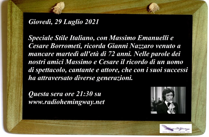 Gianni Nazzaro sarà ricordato giovedì 29 luglio alle ore 21,30 su Radio Hemignway, dopo una breve introduzione di Massimo Emanuelli e Cesare Borrometi e un intervento di Gianni Drudi (che condusse per cinque anni con Nazzaro lo show televisivo Millevoci), sarà replicata un’intervista che Gianni Nazzaro concesse ai due speaker nell’estate 2016.