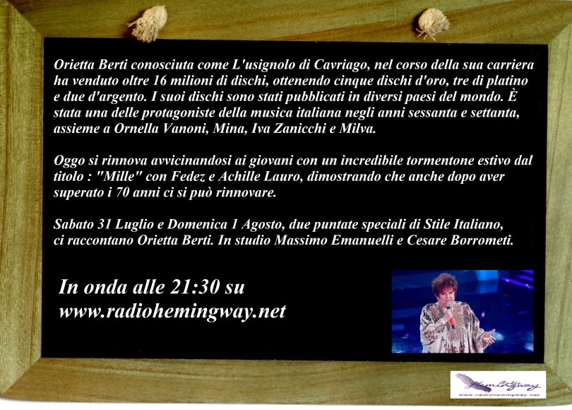 Orietta Berti con Fedez ed Achille Lauro la regina dell’estate 2021 si racconterà a Le estati canore italiane, presentano Massimo Emanuelli e Cesare Borrometi, due puntate esilaranti con la partecipazione dell’imitatore Gianfranco Guarnieri che imiterà (Giuseppe Conte, Silvio Berlusconi, Matteo Salvini, Giorgia Meloni, Enrico Letta, e, sorpresa alcuni candidati milanesi, Giorgio Goggi, Beppe Sala, Luca Bernardo, Gabriele Abbiati, Simone Sollazzo e Massimo Emanuelli, che non è candidato ahahah). Orietta Berti parlerà della sua straordinaria carriera in due puntate la prima in onda sabato 31 luglio e domenica 1 agosto alle 21,30. Le estati canore proseguirà poi su Radio Blu Italia, prossimi ospiti Enzo Gentile (autore del libro Onda su onda, dedicato ai tormentoni estivi), I Gem Boy (esilarante la loro parodia di Mille), stiamo contattando per le ultime puntate Loretta Goggi (con Giorgio Goggi ahah), Alberto Fortis, Peppino Gagliardi, Antonello Venditti (ultima puntata con Le canzoni di settembre). Anche quest’anno da Sitle italiano in versione estiva è passato il meglio della storia della musica leggera italiana.