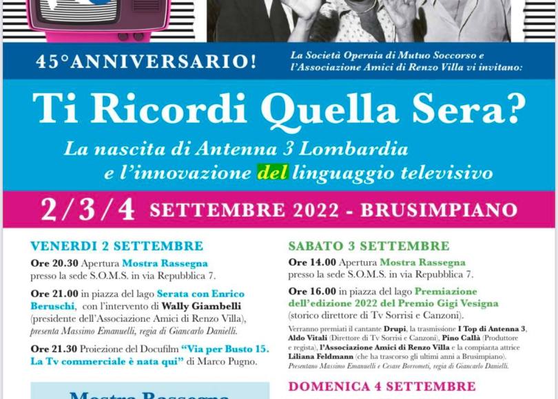 Da venerdì 2 settembre a domenica 4 settembre a Brusimpiano (Varese) tre giorni di eventi per i 45 anni di Antenna3 Lombardia oltre alla seconda edizione del Premio Gigi Vesigna. Con Enrico Beruschi, Diana Scapolan, Ettore Andenna, Wally Giambelli, Aldo Vitali, Drupi, Pino Callà, Stefano Golfari, le sorelle Feldmann, Pino Callà, Alessandro Di Milla, Massimo Emanuelli, Cesare Borrometi, Giancarlo Danielli, Patrizia Cavallin, Angelo Costanza, Sergio Giacon ed altri.