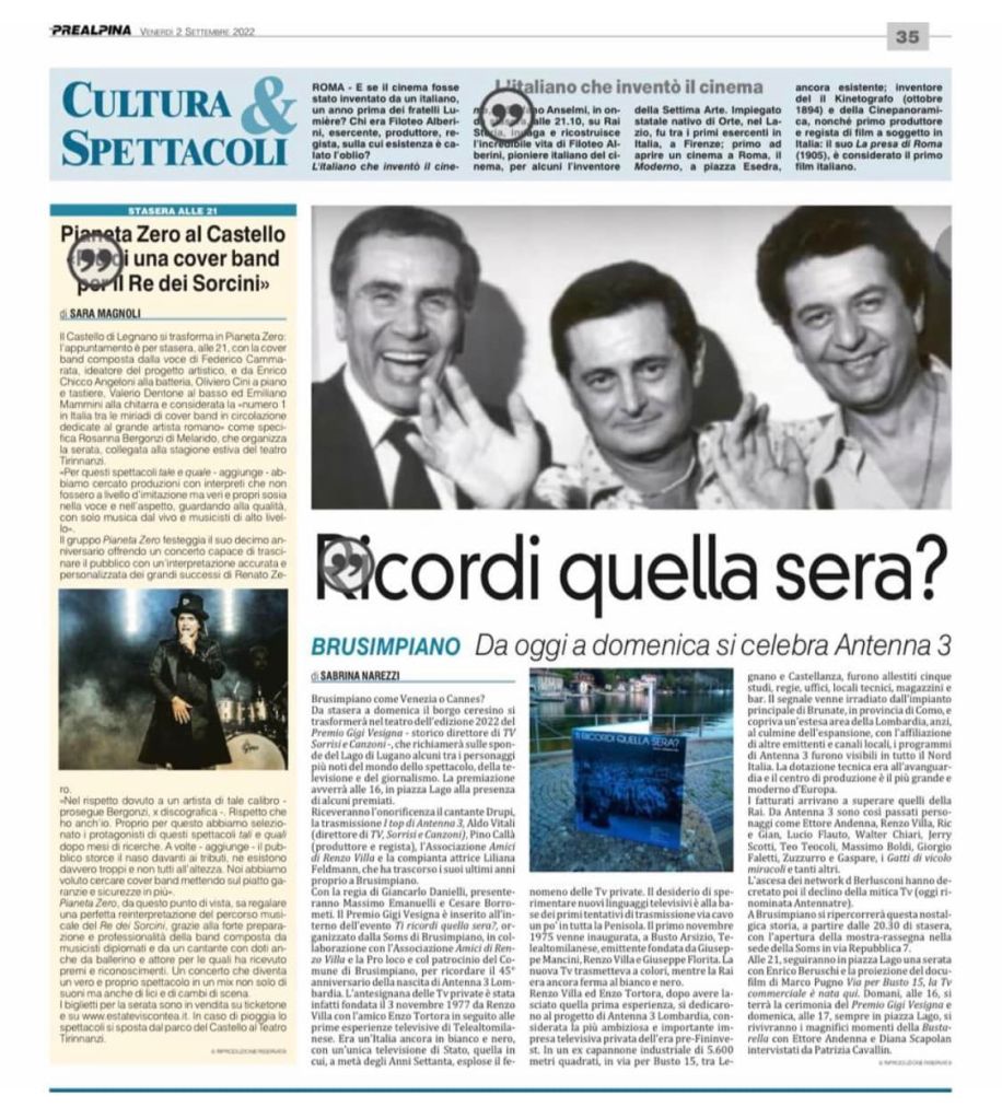 Sabato 3 settembre in quel di Brusimpiano (Varese), nell’ambito dell’iniziativa Ti ricordi quella sera? è stato conferito a Pino Callà il premio Gigi Vesigna 2022 (sezione regia televisiva). Premi anche per I top di Antenna 3 Lombardia (sezione trasmissioni televisive), hanno ritirato il premio Stefano Golfari, Marika Orlandi ed Alessandro Dimilla, l’Associazione Amici di Renzo Villa (associazione culturale ha ritirato il premio Wally Giambelli), Drupi (cantanti), premio alla memoria a Liliana Feldmann (70 anni di carriera in radio, televisione, cinema e teatro) ritirato dalla figlia Antonella, presenti anche Enrico Beruschi, la giornalista di Tv Sorrisi e Canzoni Antonella Vitali, Cesare Borrometi (co conduttore di Stile italiano la storia della canzone italiana raccontata dai suoi protagonisti), Marco Viale (organizzatore della tre giorni), Fabio Tamburini (direttore di Radio 24 e de Il Sole 24 Ore).