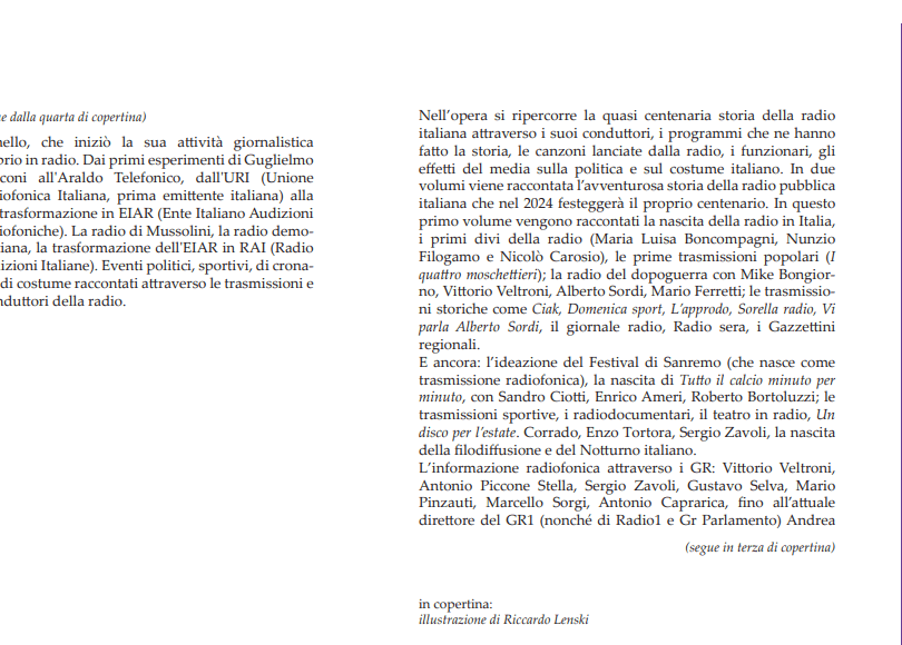 In due volumi viene raccontata l’avventurosa storia della radio pubblica italiana che nel 2024 festeggerà il proprio centenario: la nascita della radio in Italia, i primi divi della radio (Maria Luisa Boncompagni, Nunzio Filogamo e Nicolò Carosio), le prime trasmissioni popolari (I quattro moschettieri); la radio del dopoguerra con Mike Bongiorno, Vittorio Veltroni, Alberto Sordi, Mario Ferretti; le trasmissioni storiche come Ciak, Domenica sport, L’approdo, Sorella radio, Vi parla Alberto Sordi, il giornale radio, Radio sera, i Gazzettini regionali.