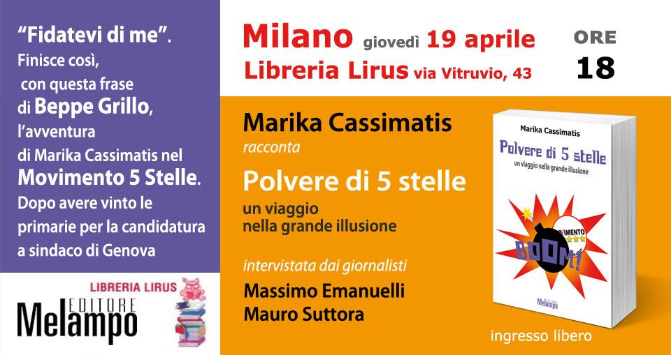 Milano 19 aprile 2018 presentazione del libro Polvere di 5 Stelle (vi consiglio la lettura) i miei libri sul cinema sulla storia di Milano, Funari e Gaber sono fuori commercio leggete il libro di Marika Cassimatis per capire i 5 Stelle. Io mi limitai ad intervenire come relatore, uno spettatore (eravamo alla vigilia delle trattative per il governo 2018 i grillini erano indecisi se allearsi con la Lega o con il Pd), mi chiese se e con chi avrebbero fatto il governo, io (ci sono ancora i video) risposi: