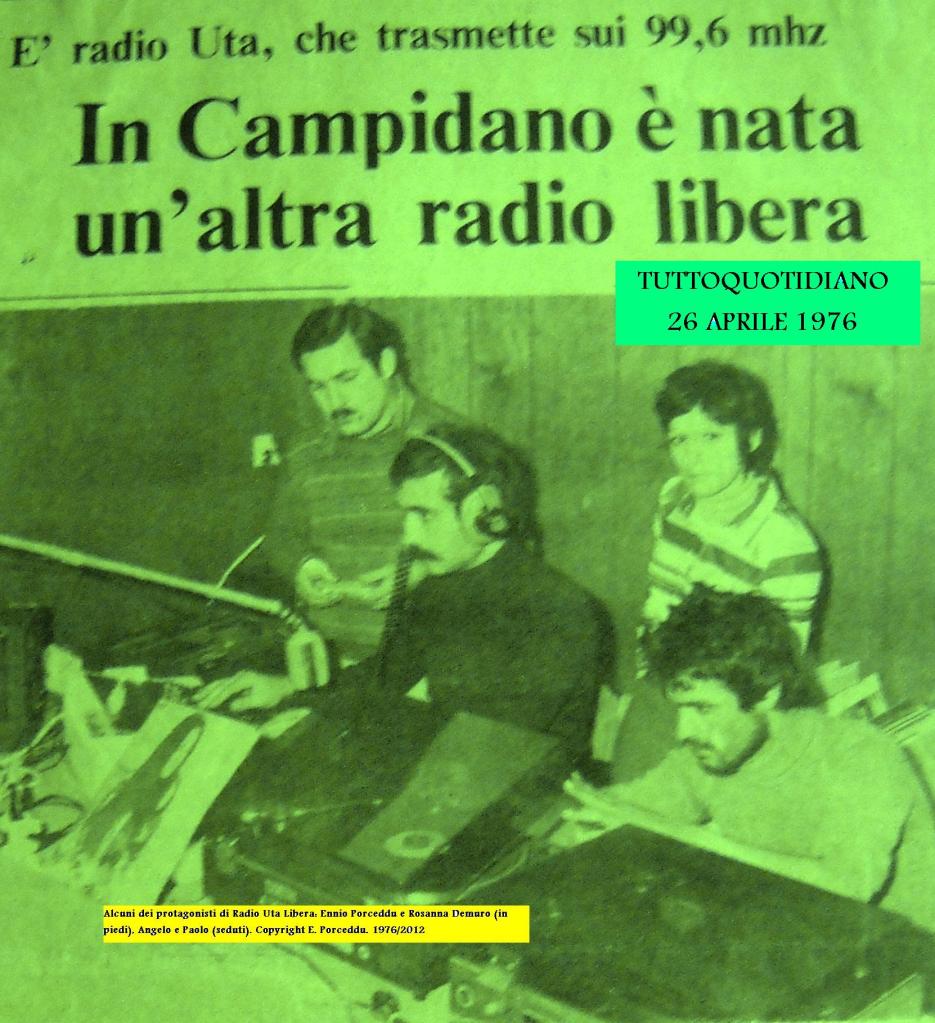 RADIO UTA LIBERA: nasce agli inizi del 1976 ad Uta (Cagliari) per iniziativa di una diecina di giovani capitanati da Sergio Sulis (un infermiere). Tra i soci fondatori ci sono tra gli altri: Ennio Porceddu (per un anno poi nel corso del 1977 direttore a Radio Cagliari Centrale), Rosanna Demuro (giornalista de L’Unione Sarda), Angelo, Ignazio, Sergio, Ennio. E’ stata la prima radio libera del Campidano irradiava i suoi programmi dai 96,600 mhz. In palinsesto annovera trasmissioni come “Il Notiziario”, Il “quiz a premi con Ennio”, “Le interviste” con i protagonisti della musica leggera italiana e della Sardegna, i programmi di musica impegnata e di cultura e persino trasmissioni dedicate ai bambini e alla musica sarda. L’emittente copre tutto il Campidano e per diversi anni ha un gran successo, poi chiude.