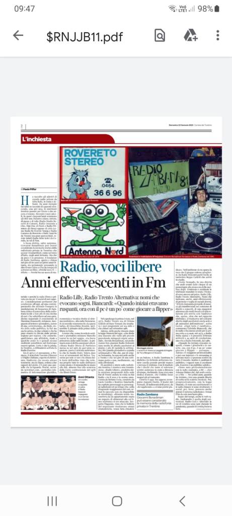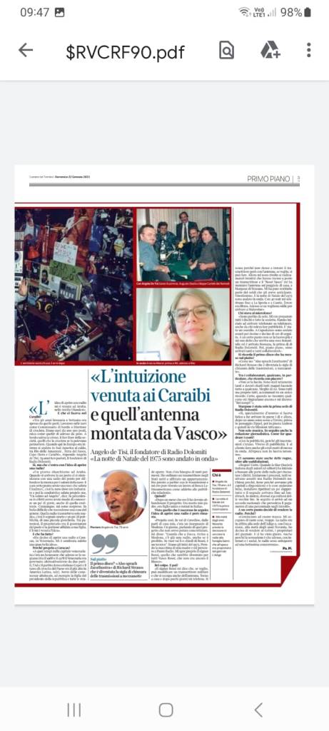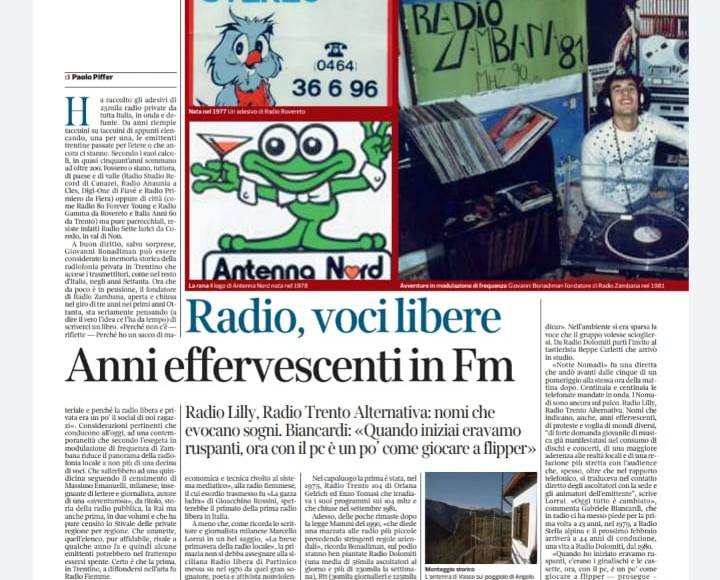 Ringrazio Andrea Piffer del Corriere di Trento, mi ha chiesto alcune informazioni sulle radio storiche del Trentino Alto Adige. Nei due volumi L’AVVENTUROSA STORIA DELLA RADIO PUBBLICA ITALIANA vi sono anche finestre sulle private (ho materiale per un nuovo volume) logicamente cito i pionieri, in questo caso Tarcisio Gilmozzi.