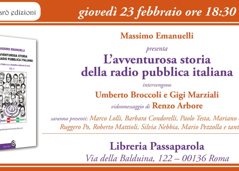 Questo il programma provvisorio, ma la libreria sarà gremita di persone che hanno fatto la storia della radiofonia italiana, Renzo Arbore manderà un videomessaggio, man mano che le persone scriveranno a me o alla casa editrice per confermare la loro presenza saranno aggiunti. Ugualmente per prenotare posto a sedere scrivete alle seguenti mail: