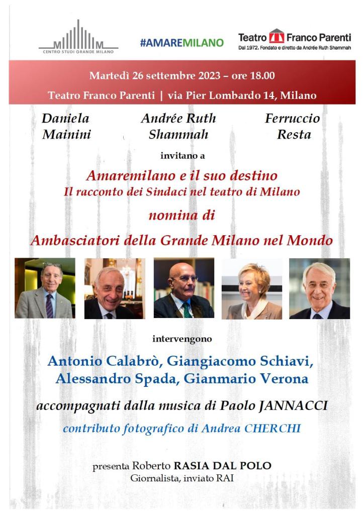 Ai primi cittadini sarà conferita la nomina di Ambasciatori della Grande Milano nel Mondo L’evento, organizzato dal Centro Studio Grande Milano si svolgerà appunto martedì 26 settembre alle ore 18 al Teatro Franco Parenti in Via Pier Lombardo.