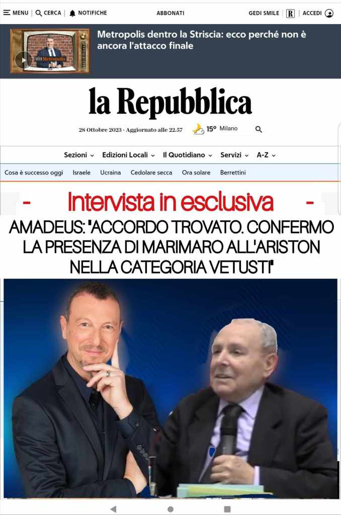 Verso la fine di settimana prossima comunicheremo giorni e date di messa in onda del Premio Gigi Vesigna edizione 2023 presenti Canale Italia, Antenna3 Lombardia, poi vi sarà anche radiovisione su Stazione Universo e Radio All Years. Nonché, in audio intervallate dai brani di Nicola Di Bari, messa in onda su Radio Blu Italia, l’emittente della comunità italiana in Australia e su Radio Free Live, emittente capofila del Massimo Emanuelli Show/L’angolo della scuola e di Stile italiano la storia della canzone italiana raccontata dai suoi protagonisti, nonché Stile italiano Radio 100 la storia e le voci della radio.