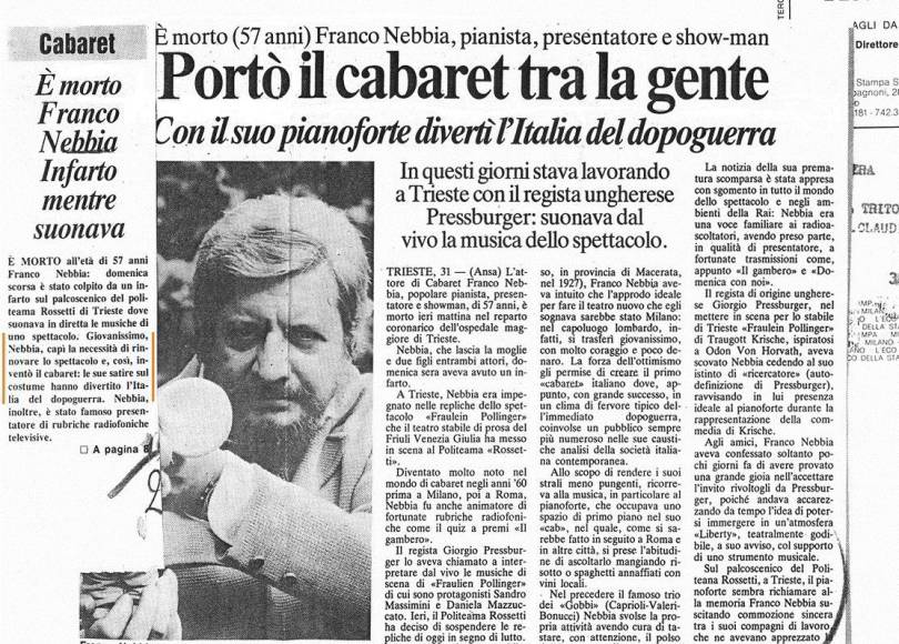 Franco Nebbia nacque a Roma il 15 dicembre 1927, esordì in radio nel 1969 sostituendo Enzo Tortora alla conduzione de Il gambero che manterrà fino al 1975. E’ anche autore de Il bambulto (1969), è quindi regista de La chiacchierina (1969) e di A qualcuno piace nero (1970). Nel 1977 Nebbia presentò alcuni special dedicati a personaggi del mondo dello spettacolo, quindi conduce su Radio3, a partire dal 1977, Pranzo alle otto, musiche e canzoni soprattutto di ieri e La stravaganza (sempre su Radio3 e sempre nel 1977). Seguono Domenica con noi, ovvero come ascoltare la radio ed essere felici (1978-1980), Tutto è perduto! Fuorché l’umore e Sgap (1978). Dal 1982 alla morte Nebbia condusse Piano bar. Morì a Trieste il 30 ottobre 1984.