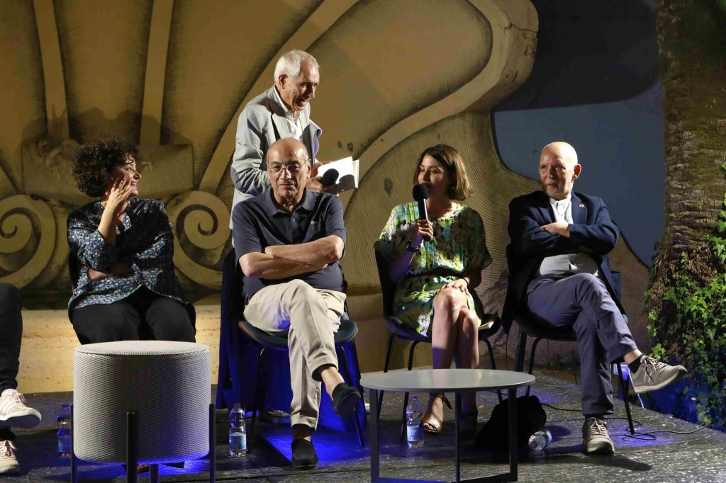 Incontri con l’autore edizione 2023: Mimmo Minuto con Andrea Vianello, i vincitori del Premio Strega, Massimo Emanuelli e il giornalista di Tv Centro Marche Daniele Andreani.