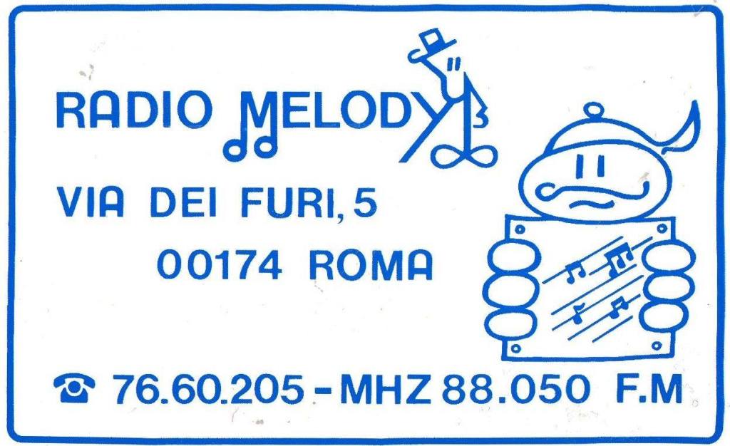 RADIO MELODY: 88,050 MHz., sede via dei Furi 5 Roma.