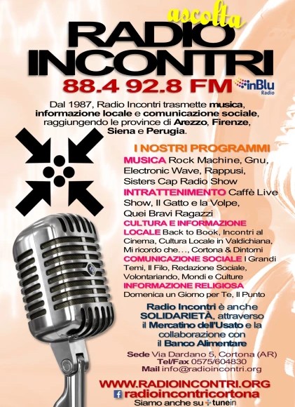 Radio Incontri nasce nel 1987 a Cortona, ha sede in via Dardano 5. E’ una realtà a carattere comunitario, che trasmette sulle frequenze 88.4 MHz e 92.8 MHz, coprendo un’area che comprende le province di Arezzo, Perugia, Siena e Firenze. La programmazione variegata comprende vari contenitori realizzati in diretta; Ogni Martedì alle ore 21.00 in diretta dal Caffè “La Saletta” di Cortona (AR) va in onda “Caffè Live Show” un varietà radiofonico esilarante a cui prendono parte anche gruppi musicali e culturali. L’emittente (ascoltabile anche in streaming, www.radioincontri.org) è affiliata al circuito In Blu. Le voci attualmente in onda sono: Albano Ricci, Alberto Prisco, Alessandro Ferri, Andrea Caneschi, Andrea Laurenzi, Antonella Campanaro, Carla Rossi, Carlo Baione, Carlo Lancia, Daniele Ferri, Don Ottorino Cosimi, Eugenia Roselli, Fabio Gallinella, Fernanda Cherubini, Flavio Barbaro, Francesca Pellegrini, Giorgio Fanelli, Iacopo Maccioni, Greta Capecchi, Lara Giminiani, Lucia Pareti, Luigi Capecchi, Maria Vittoria Pierleoni, Paolo Merlo, Pierluigi Manfreda, Stefano Bertini, Silvia Vecchini, Tommaso Angrisano, Veronica Menchetti.