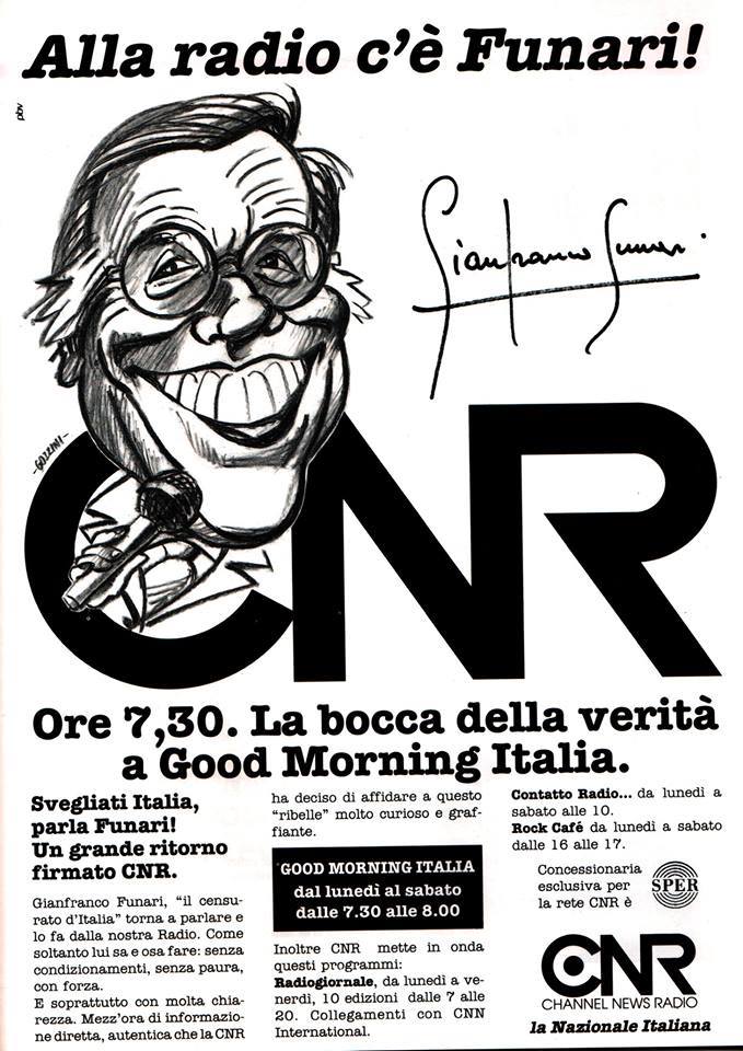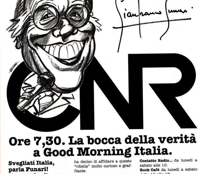 Funari tornò in radio all’inizio degli anni ’90 all’apice della sua popolarità, questa volta su Cnr, network che a Milano trasmetteva sulla frequenza che fu di Radio City. Il giornalaio più famoso d’Italia era mattatore di un morning show in onda alle 7,30 dal lunedì al al venerdì intitolato Good morning Italia, nel quale commentava alla sua maniera le notizie del giorno tramite una rassegna stampa. Anche questa esperienza durò poco (come la stessa Cnr), ma non va dimenticata, anche se Funari è stato essenzialmente un personaggio televisivo.