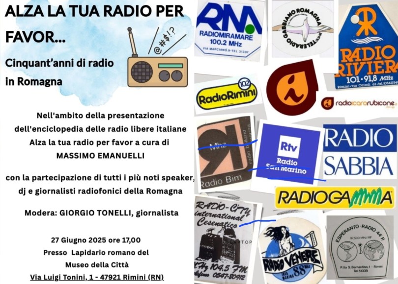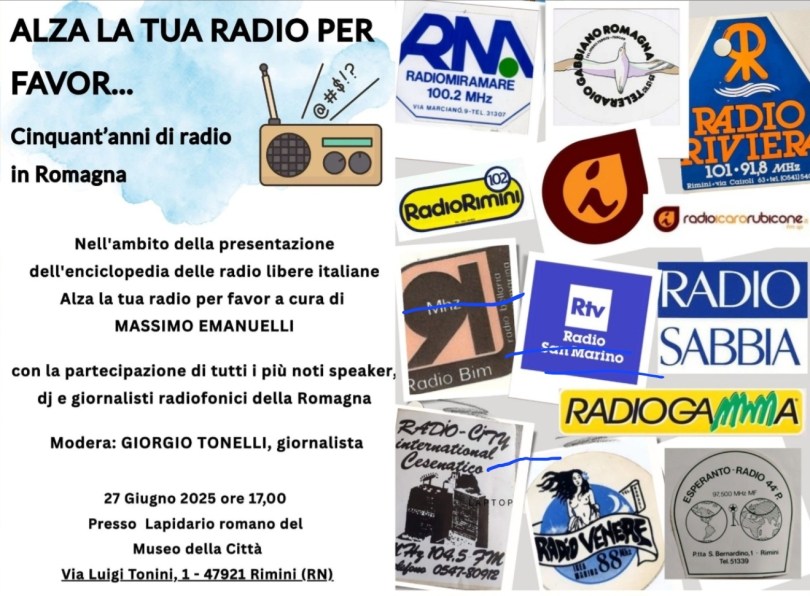 Venerdì 27 giugno alle ore 17 si ritroveranno gli storici di dj, speaker e giornalisti delle radio della Romagna, ma anche di San Marino, Pesaro, Cesena ecc. Nell’ambito della presentazione dell’enciclopedia delle radio italiane Alza la tua radio per favor a cura di Massimo Emanuelli, l’incontro è organizzato da Cristiano Paci. Modererà Giorgio Tonelli già giornalista Rai e vicepresidente del Corecom Emilia Romagna. Hanno finora aderito: Gilberto Gattei, Valentino Berti, Mirco Zani, Sergio Barducci, Stefano Gori, Claudio Coveri, Marco Corona, Betty Miranda, Giorgio Betti, Alfredo Piersanti, Eddy Botturi, Giorgio Fagnocchi ed altri. Presto aggiorneremo il tutto con altri nomi. Si ripercorrerà la storia dell’emittenza privata dagli esordi ai nostri giorni partendo dal 1945 allorquando Sergio Zavoli con Renato De Donato e Glauco Cosmi, diede vita in quel di Rimini “Voci della città’ una sorta di radio via cavo che tramite altoparlanti da piazza Cavour, via telefono (con amplificazione effettuata dagli stessi altoparlanti) faceva le radiocronache del Rimini calcio e dava notizie ai cittadini di una Rimini semidistrutta. Per poi passare a Radio Isola delle Rose sorta in quel di Torre Pedrera nel 1958, e, ancora, la prima radio libera riminese, Radio Rimini nata nel dicembre 1975, Radio Riviera, Radio Sabbia di Riccione (ancora oggi attiva), Radio Gamma di Savignano sul Rubicone, Radio Amico Libro fondata da Fiorello Paci, e tutte le altre emittenti riminesi. Ma anche Radio Antares di Novafeltria, le varie radio San Marino, le radio della provincia di Cesena-Forlì ed altre.