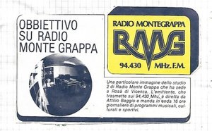 Emittente di Rosà (Vicenza) nata nel 1974 per iniziativa di Attilio Baggio (già componente dei Luna di Pesce, affermato complesso negli anni ’60, e artigiano della ceramica). Appassionato di elettronica, e in particolare di amplificazione musicale prendendo spunto da Radio Capodistria acquista delle apparecchiature per trasmettere. Radio Montegrappa è la prima radio libera della provincia di Vicenza, e una delle prime in Veneto, grazie all’etere ancora libero copre le province di Vicenza, Verona, Padova, Rovigo, Venezia e Treviso. I programmi sono irradiata dai 94,430 mhz, successivamente dai 103,400. Attilio Baggio (1942-2008) gestisce la radio (che ha sede in via Capitano Alessio 134 a Rosà) con la moglie Odilia, al figlio Mauro Baggio e ad alcuni giovani collaboratori. Il primo palinsesto è esclusivamente musicale con dediche, auguri per le feste di compleanno e per gli anniversari, lo stesso Baggio, con lo pseudonimo di “Attilio la Verga” è al microfono e alterna alla musica le sue proverbiali battute umoristiche, in radio arrivano telefonate da tutto il Veneto. Il palinsesto è ricco di trasmissioni musicali (fra le voci storiche quella di Gianfranco Mazzoccato), culturali, sportive, politiche e di informazione. Fra gli altri collaboratori Dj Quattordici, Ricky B, e Kety Baggio. Oltre alla Santa Messa, l’emittente propone rubriche di servizio, le radiocronache del Vicenza calcio e quelle del rally. Grande riscontro per la trasmissione del martedì e del venerdì Lo sport dal Grappa alla Castellana dove si parla del calcio dalla terza categoria fino alla serie A, con particolari cenni, commenti ed interviste del girone in cui milita l’A.C. Calcio Vedelago. La trasmissione inizia così: “Dagli studi di Radio Monte Grappa trasmettiamo Tutto lo sport del Grappa alla Castellana, trasmissione condotta e diretta da Giorgio Volpato e Gianni Ras sponsorizzata dai Grandi Magazzini Pellizzari di Vedelago. Sportivo, ricorda, è elegante e non teme pari chi veste da Pellizzari”. Attilio Stradotto manda in onda una trasmissione unica in Italia: Tutti i rally minuto per minuto, con collegamenti diretti ed il pubblico che conosce la classifica aggiornata dopo cinque minuti dal transito del concorrente della prova speciale per una rete di giornalisti inviati: Rally di San Remo, San Martino, Corsica, Sardegna, Targa Florio, sono radiotrasmessi e ascoltati, sia in diurna che in notturna dagli amanti di detto sport. Molti giornalisti importanti collaborano con commenti e servizi: Piergiorgio Zavarese, l’attuale giornalista capo redattore della pagina sportiva del Gazzettino settore trevigiano commenta la serie A di calcio. Memorabili le serate in cui, il principe dei giornalisti italiani, Giorgio Lago, direttore del Gazzettino, dalla sede di Venezia, con collegamento telefonico illustra fatti e commenti di notizie sportive su questioni ancora inedite al pubblico italiano. Nell’immaginario collettivo di molti vicentini sono rimaste le cene annuali di Radio Montegrappa con gli ascoltatori. Radio Montegrappa si distinse anche per una battaglia contro la prostituzione lungo la statale della Valsugana. Negli anni ’80 Baggio da anche vita a TeleMontegrappa che però chiuderà poco prima della legge Mammì per concentrarsi sulla radio. La radio resisterà fino al 1996 allorquando cedette le sue frequenze a Radio Maria.